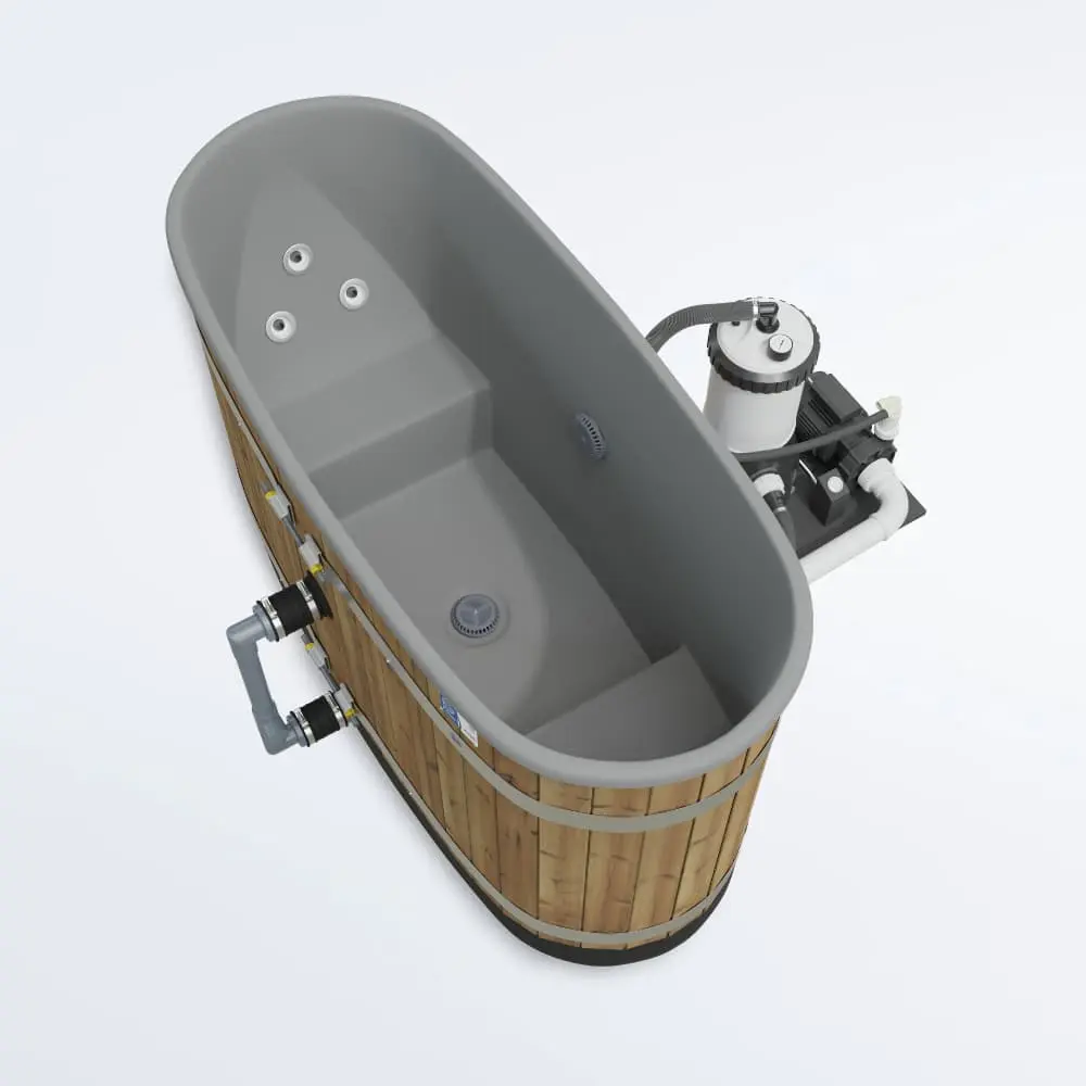 La tinozza in legno Tiny Flow è una nuova aggiunta alla gamma PREMIUM equipaggiata di sistema idromassaggio. Il rivestimento esterno in legno di pino finlandese Thermowood™ garantisce maggior stabilità e durevolezza nel tempo. Gli eleganti interni di colore grigio chiaro in HDPE offrono due comode sedute sagomate che integrano perfettamente 3 getti idromassaggio regolabili per ciascun lato. Questa vasca piccola e leggera, è facile da installare e rappresenta la soluzione ideale per arricchire piccoli giardini, terrazzi urbani e suite d’hotel. Le sue ridotte dimensioni ne fanno la scelta ideale per godersi un caldo bagno in solitaria o in coppia.
