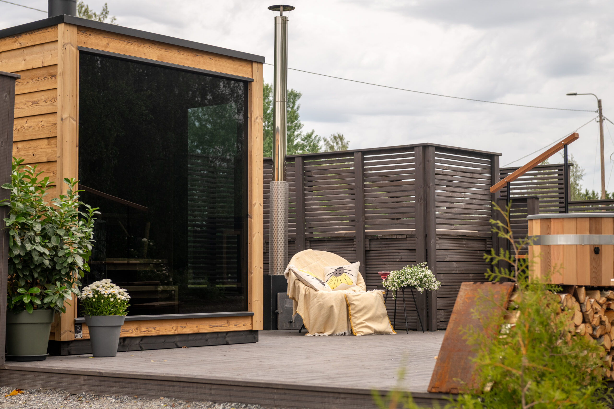 Scopri la sauna da esterno Kirami FinVision® M Dawn, perfetta fusione tra design nordico, tecnologia avanzata e sostenibilità. Questa sauna compatta ma accogliente, completa di finestra panoramica fronte natura, è pensata per offrire una vera esperienza “löyly” a 4–6 persone.